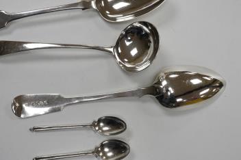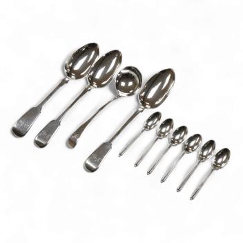 Lot 844 , A matched set of three 19th century silver fiddle pattern tablespoons, Josiah Piercy I, London, 1828(2) and The Lias Brothers, London 1831, together with a George III silver Old English pattern sauce ladle Peter & Willia