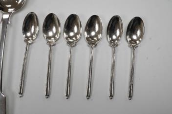 A matched set of three 19th century silver fiddle pattern tablespoons, Josiah Piercy I, London, 1828(2) and The Lias Brothers, London 1831, together with a George III silver Old English pattern sauce ladle Peter & William Bateman, London, 1806 and a set of six 20th century silver coffee spoons by Walker & Hall, 10.4oz.