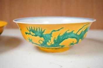 Lot 1254 , A Chinese yellow ground ‘dragon’ dish and bowl, Ming dynasty marks but later, 19cm diameter