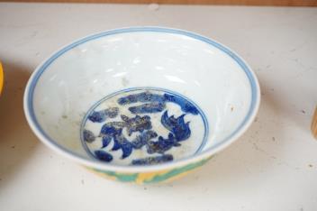 A Chinese yellow ground ‘dragon’ dish and bowl, Ming dynasty marks but later, 19cm diameter