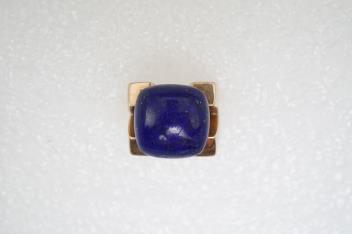 Lapis approximately 14 x 14mm. Wear to lapis and gold. Lapis glued into mount - could be a replacement stone, but could also be original - in any case looks in keeping with the design. Overall in good, wearable condition, and a very stylish late Deco design.