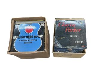 Two boxes of jazz LP record albums, artists including; Charlie Parker, Benny Goodman, Shirley Scott, Dave Brubeck, Buddy Rich, Maynard Ferguson, Georgie Fame, Duke Ellington, Herb Geller, Ida Cox, etc.