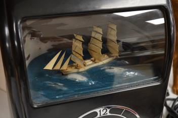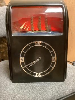 Case visually good; when plugged in, the orange back-light works but the ship’s motion only works when the handle at the back is turned. Clock not working.