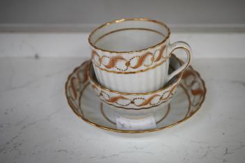 Ten items total. Trio teabowl minor chip to underside of footrim; saucer with two cracks inward from rim, each reaching foortim. Pair of pattern 129 teabowls and saucers - one saucer with firing crack and minor nicks to rim, image 8; wrythen teabowl footrim chipped, image 9; some discoloured crazing. Single saucer crack at rim, image 10.