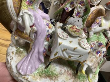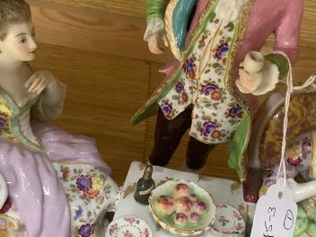 Female with part-green dress - object held in her left hand restored at the top and damaged/incomplete; hands of both females professionally restored; top-half of bottle on table restored; table one front leg restored; goblet held in gent’s hand restored; possible further small restored areas; some wear to gilding around plinth.
