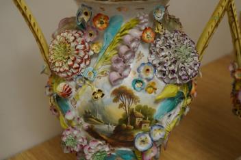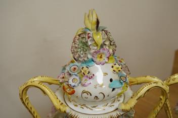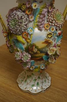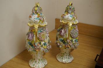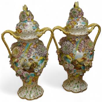 Lot 415 , A pair of English porcelain floral encrusted vases and covers, c.1830, possibly Samuel Alcock, each painted with landscapes, 44cm high