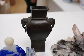 Lot 1379 , A Chinese bronze small vase, 19th century, rose quartz-14cm and Kyanite specimens, a soapstone seal and a glass snuff bottle