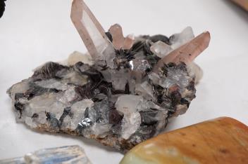 A Chinese bronze small vase, 19th century, rose quartz-14cm and Kyanite specimens, a soapstone seal and a glass snuff bottle,