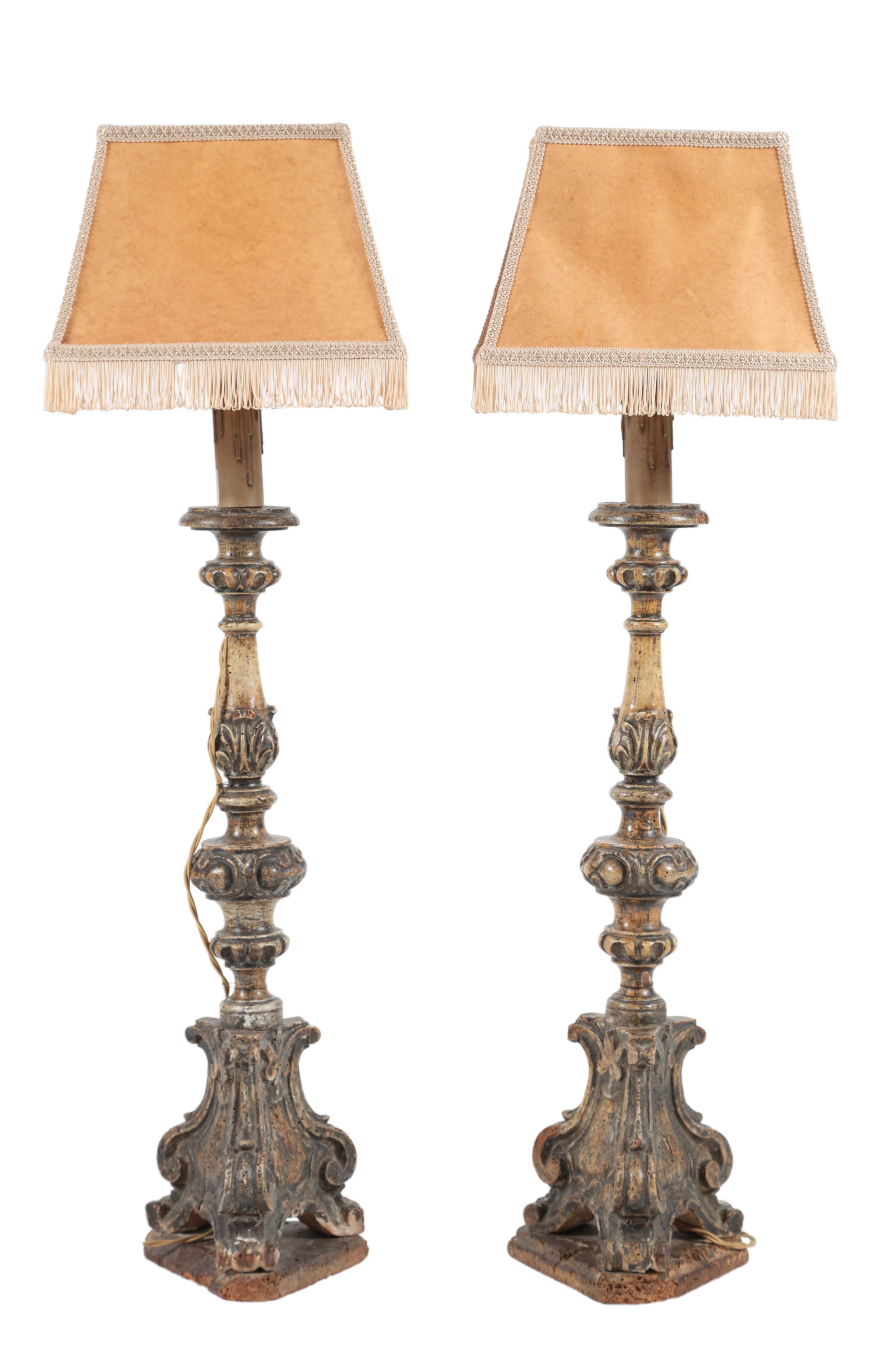 Lot 205 , A pair of Italian silvered and carved wood altar candlesticks