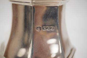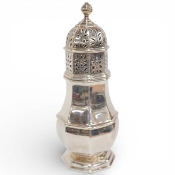 Lot 1016 , A George V silver octagonal baluster shaped sugar caster, Thomas Bradbury & Sons, Sheffield, 1927, 19.6cm, 11oz.