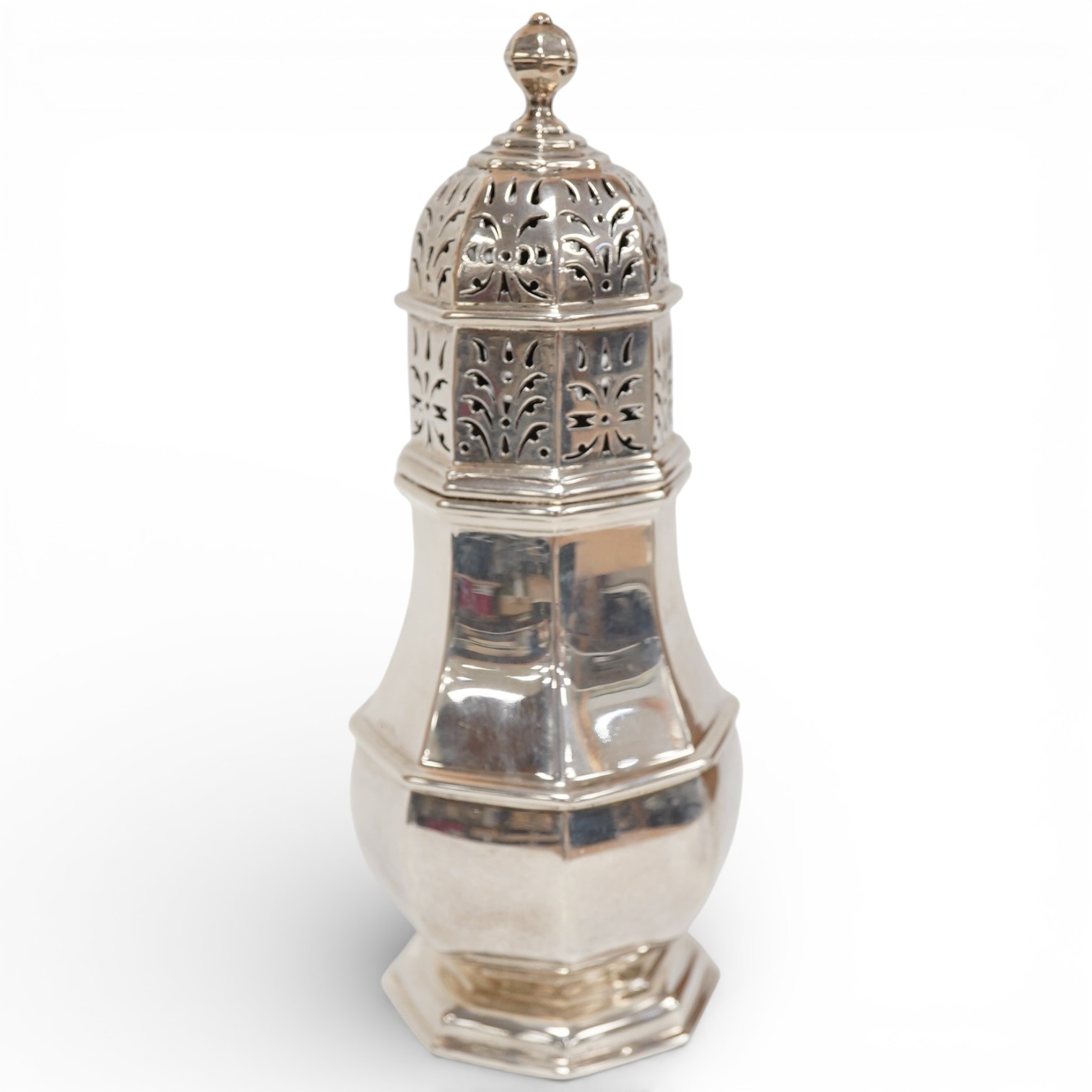 A George V silver octagonal baluster shaped sugar caster, Thomas Bradbury & Sons, Sheffield, 1927, 19.6cm, 11oz.