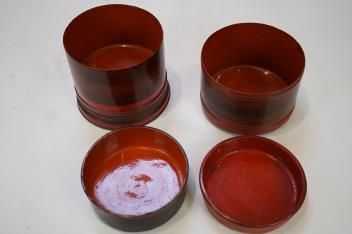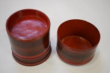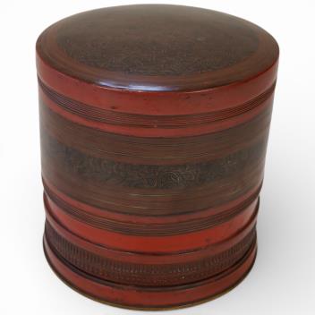 Lot 30 , A Burmese cylindrical four sectional lacquered box and cover, 19cm high