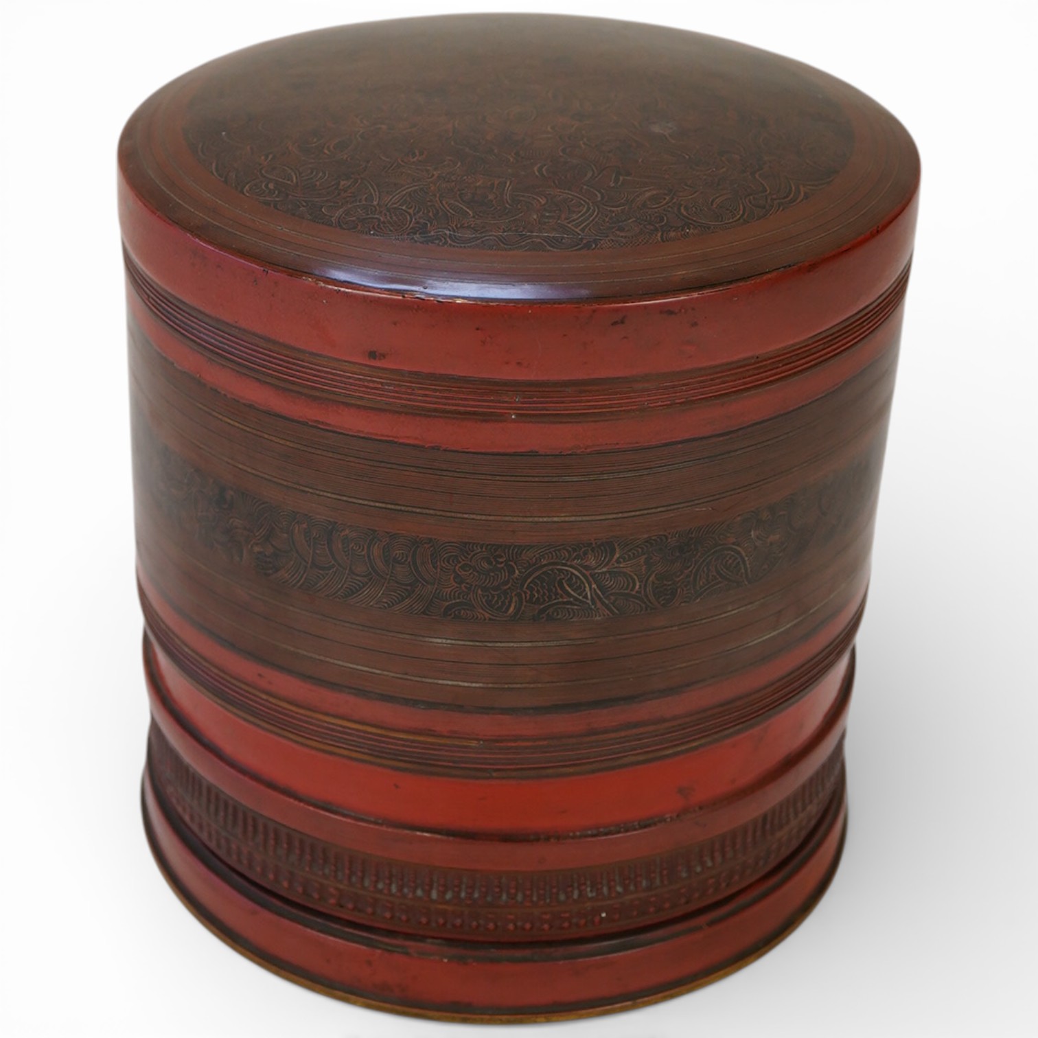 A Burmese cylindrical four sectional lacquered box and cover, 19cm high