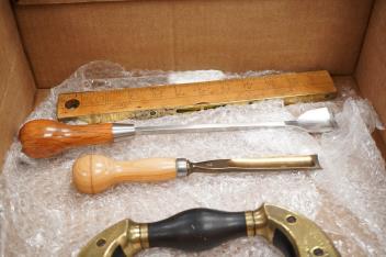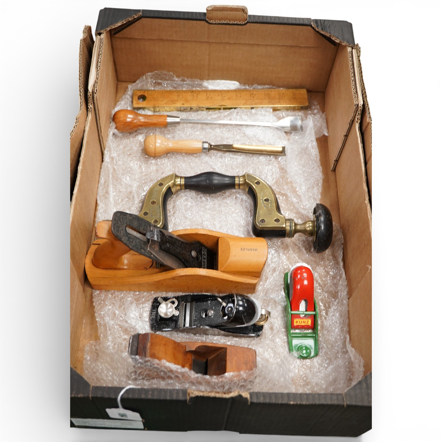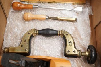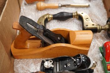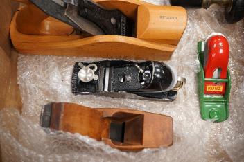 Lot 1064 , Eight woodworking tools; three block planes by Stanley, Kunz, etc. a Marples wooden smoothing plane, a Palmer & Co. Brighton brass and ebony brace, two gouges and a boxwood spirit level