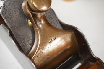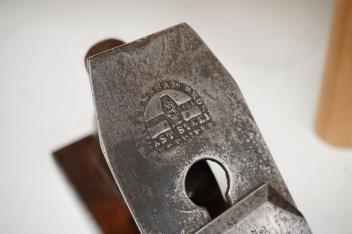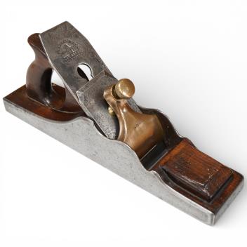 Lot 1050 , A Spiers dovetailed jack plane, stamped; Spiers Ayr to the lever cap, and fitted with an Earnshaw Bros. 2 1/2 inch iron, the sole 13 1/2 inches long, rosewood infill with the front grip crudely removed, owners stamps to