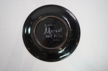 § Jean Lurçat (1892-1966): A green glazed earthenware plate, decorated with a stylised central figure, with black and white rim and black glazed underside, painted marks to the underside "Dessin J. Lurcat Sant-Vicens V.A.6", 24.7cm diameter