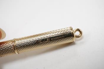 A 1960's engine turned 9ct gold cased toothpick, by S.J. Rose & Son Birmingham, 1961, 44mm. (a.f.).