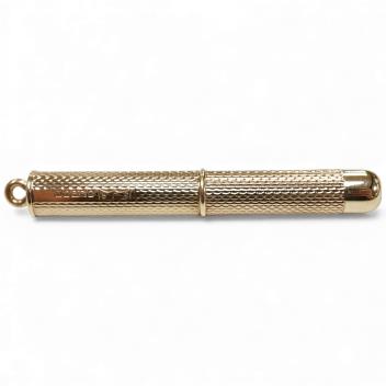 Lot 904 , A 1960's engine turned 9ct gold cased toothpick, by S.J. Rose & Son Birmingham, 1961, 44mm. (a.f.).