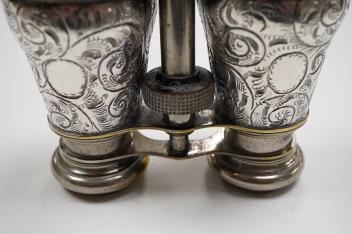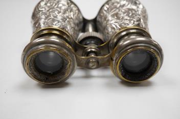 Lot 827 , A pair of late Victorian repousse silver mounted plated brass opera glasses, Henry Charles Kelly, Birmingham, 1900, 8.8cm by 11.6cm.