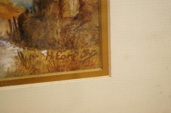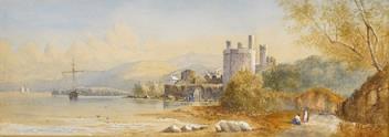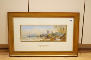 Lot 762 , Henry Earp Snr. (1831-1914), Lakeside landscape with castle, signed, watercolour heightened with white, 14.5 x 40cm