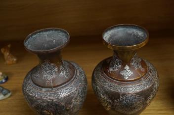 A pair of Cairoware silver and copper inlaid brass vases, 24cm high
