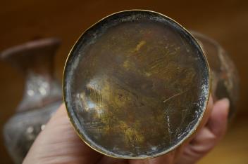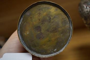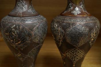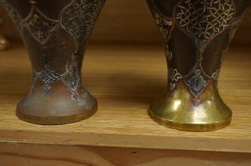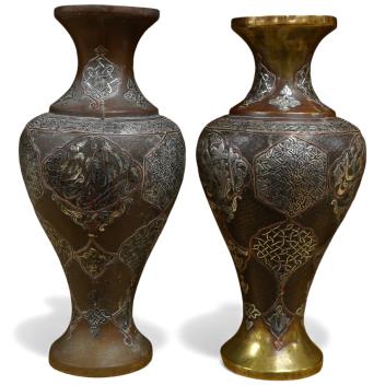 Lot 361 , A pair of Cairoware silver and copper inlaid brass vases, 24cm high
