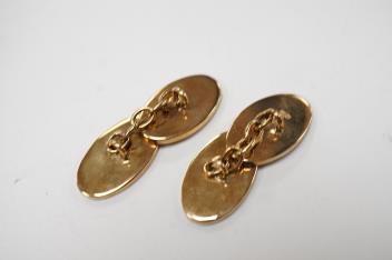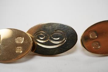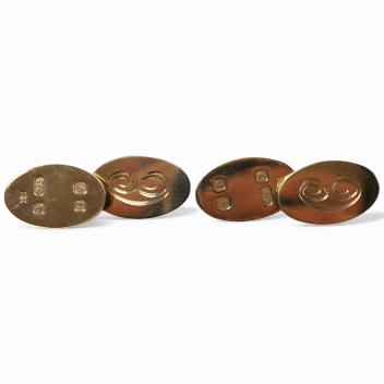 Lot 930 , A modern pair of 9ct gold oval cufflinks, engraved with the monogram EC, maker DJ, Birmingham, 1998, 12 grams, with box.