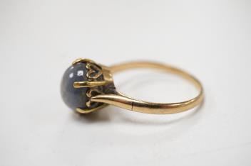 A yellow metal and single stone claw set star sapphire ring, size P, the stone approx. 9mm in diameter.