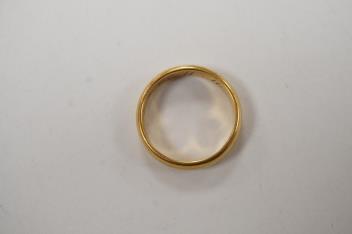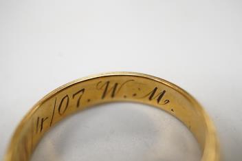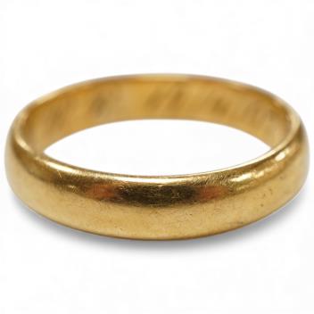 Lot 937 , A Far Eastern yellow metal wedding band with engraved inscription, stamped '20', size O, 5 grams.