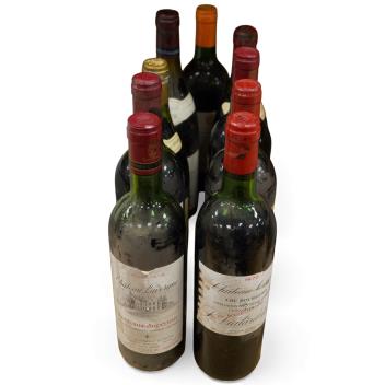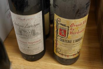 Lot 319 , Nine bottles of wine; three Chateau Lavergne Bordeaux Superieur 1979, Beaune 1974, Côtes du Rhône 1978, Beaujolais 1979, etc.