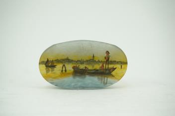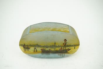 Daum Frères, Nancy: A ‘Venetian Lagoon’ cameo glass pillow-shaped vase, the textured body with enamelled decoration of figures on gondolas and small boats, signed “Daum, Nancy” beside the Cross of Lorraine to the underside, 18cm wide x 10cm high