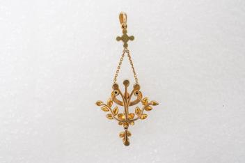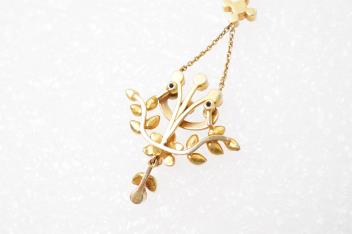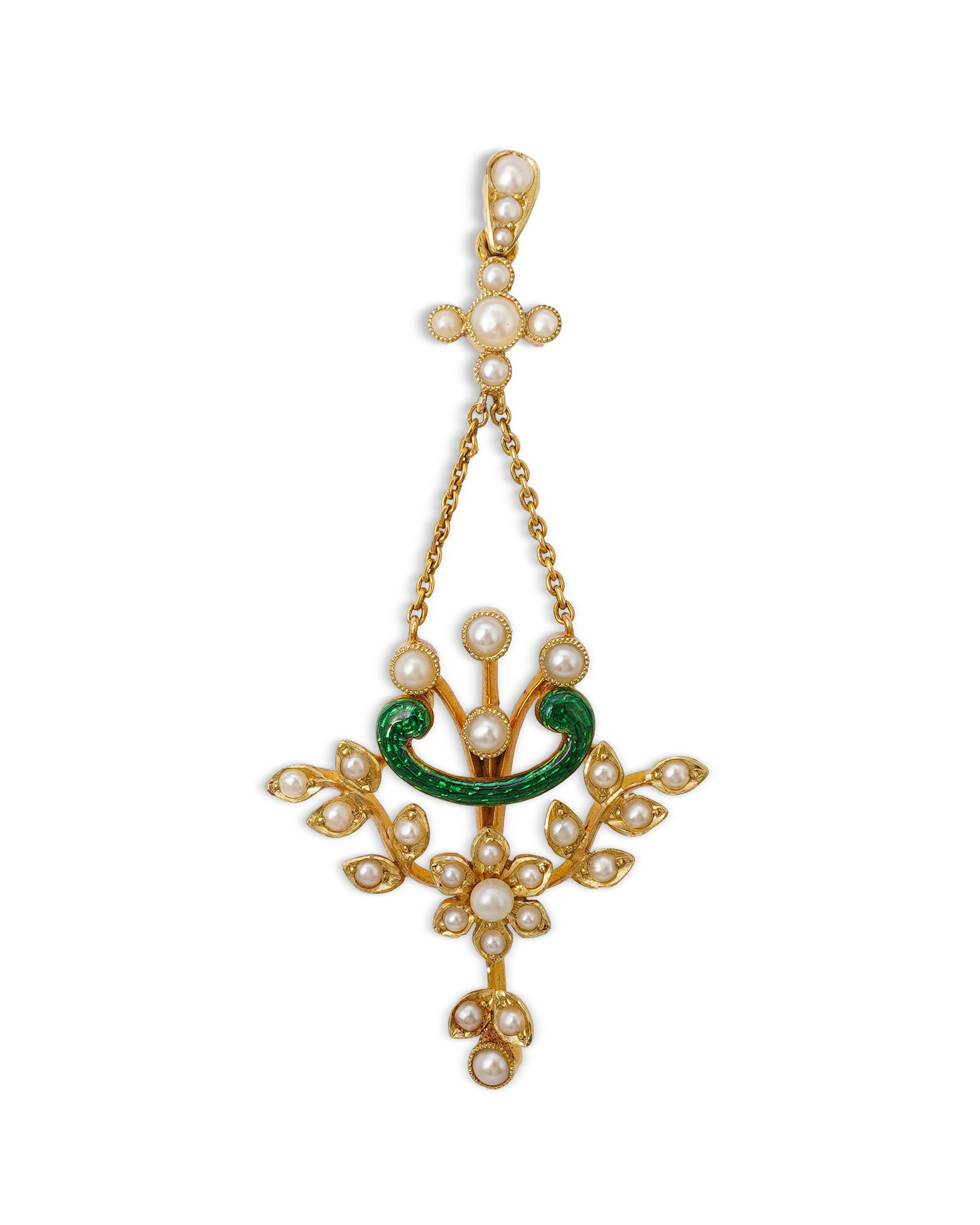 An Edwardian seed pearl and enamel pendant, early 20th century, of floral design, set with seed pearls and a scrolled motif applied with green enamel, suspended by two chains from a seed pearl surmount and bail, mounted in gold, length 5.3cm, stamped 15CT, gross weight approximately 4 grams, pearls untested