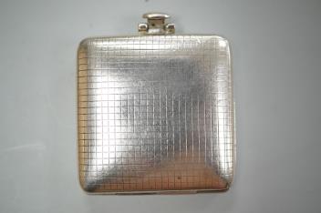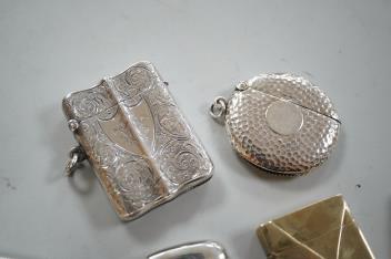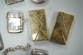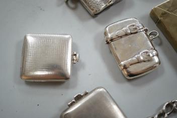 Three assorted silver vesta cases including one with a white metal chain, two gilded 900 standard white metal vesta cases, designed as a letter with postage stamp, 60mm, one 925 vesta case modelled as a satchel and two silver travelling watch cases(no watches).