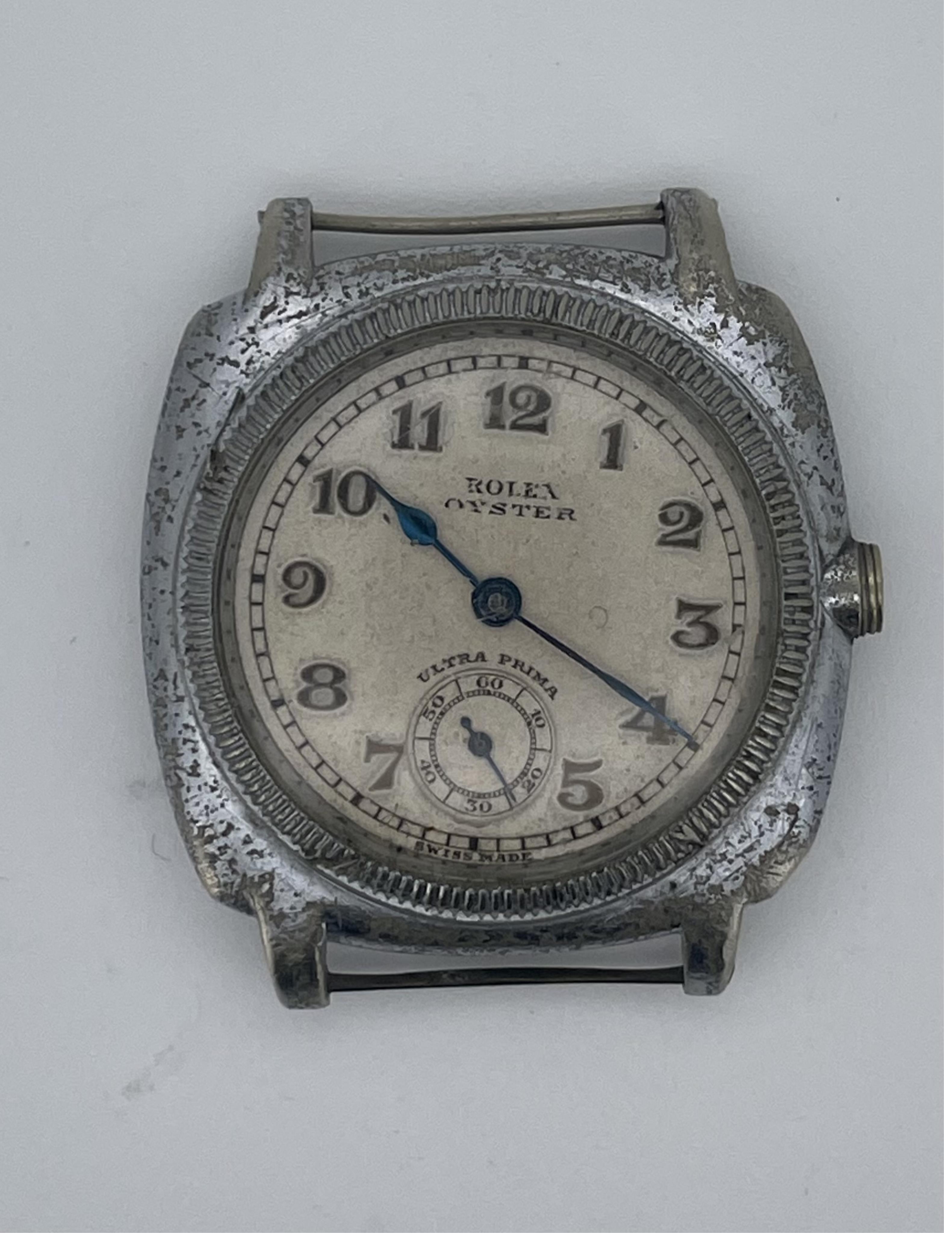 Lot 1928 , A gentleman’s 1930’s Rolex Oyster Ultra Prima chrome cased manual wind wrist watch, with Arabic dial, subsidiary seconds and cushion case, lacking winding crown and strap, case diameter 30mm.
