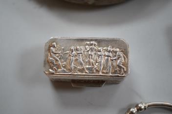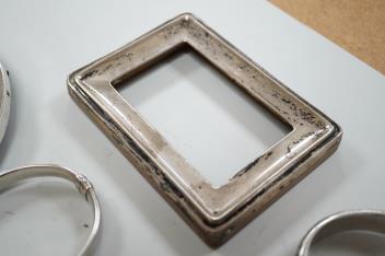 Lot 1841 , A small group of silver items including a William IV vinaigrette, William Simpson, Birmingham, 1835, 30mm, a later stamp case, two mounted photograph frames, two hinged bangles, together with a group of sterling or white