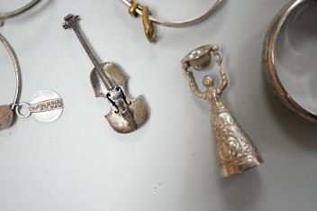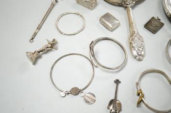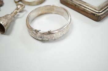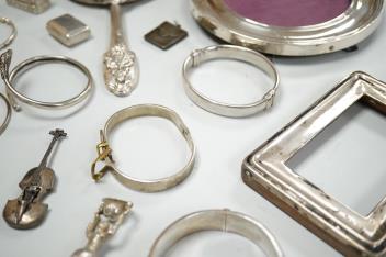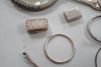 A small group of silver items including a William IV vinaigrette, William Simpson, Birmingham, 1835, 30mm, a later stamp case, two mounted photograph frames, two hinged bangles, together with a group of sterling or white metal items, including a seal, hand mirror, miniature wager cup, swizzle stick, etc.