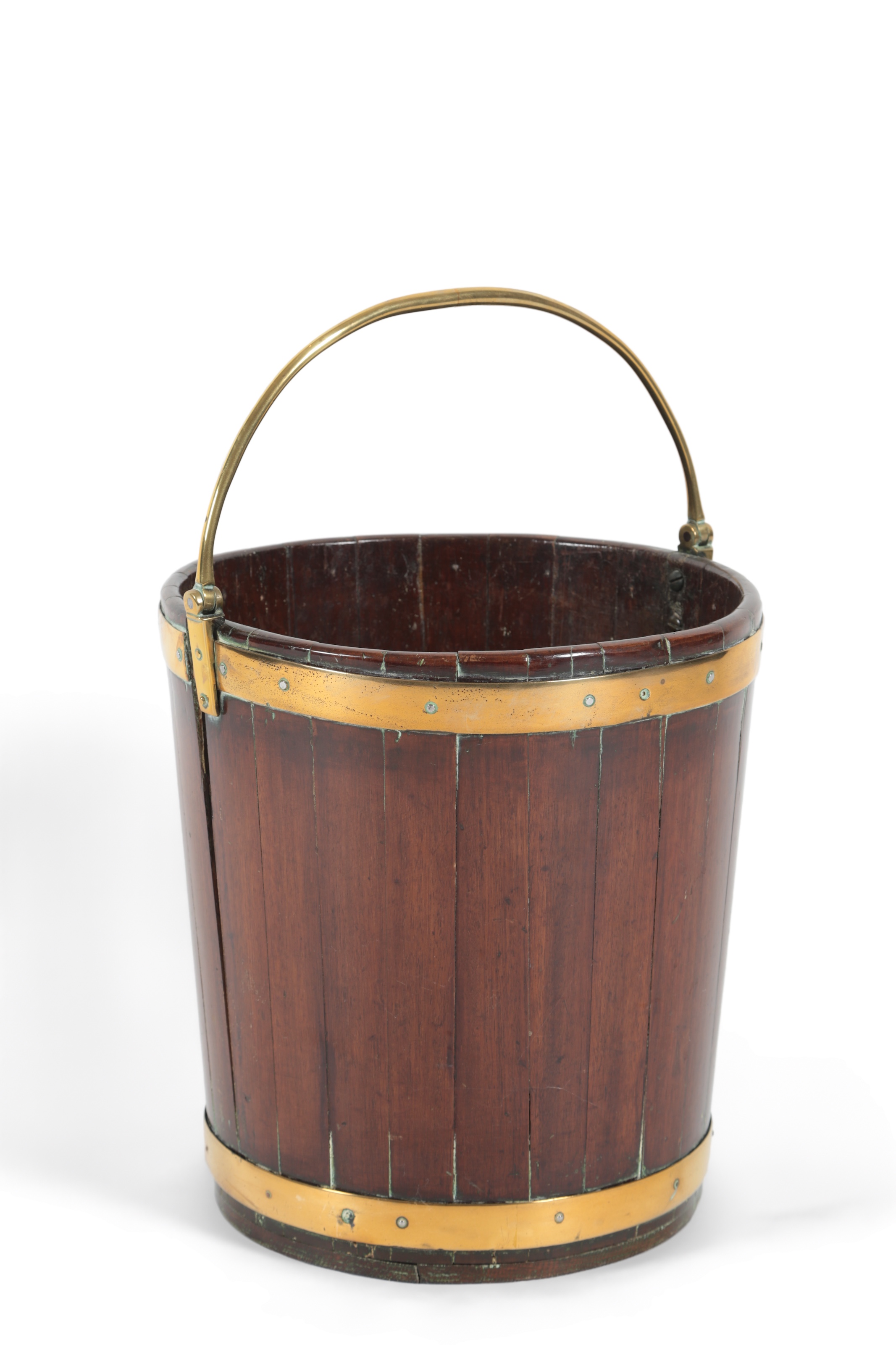 A George III brass bound staved mahogany peat bucket, with brass swing handle, 38cm diameter, 40cm high