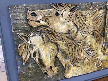 Lot 1733 , Beryl Maile, ‘Wild Horses’, Dolphin Gallery label verso, relief panel, 76 x 198cm