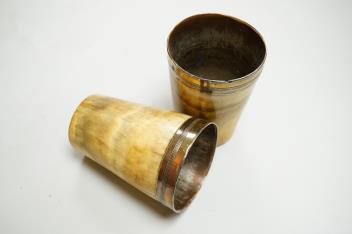 Lot 1852 , A near pair of 19th century white metal mounted horn beakers, unmarked, height 10.2cm et infra.