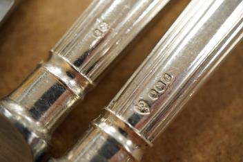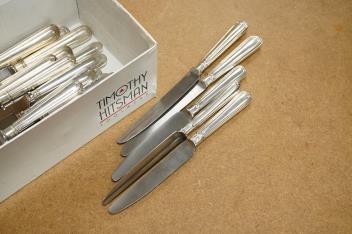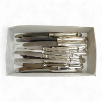Lot 1854 , A modern set of six silver handled steel table knives and six dessert knives, maker DJS, Sheffield, 1973, together with a set of six silver plate handled steel table knives and six dessert knives.