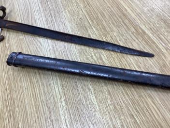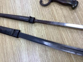 Lot 27 , A 19th century Eastern European sword yataghan in its brass mounted leather covered scabbard, a Chassepot in its iron scabbard and three gras bayonets in their scabbards