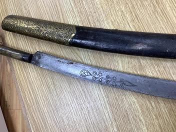 They are all in generally fair to good condition, with some overall surface rust to the blades and minor losses and dents. Yataghan blade; 58.5cm.