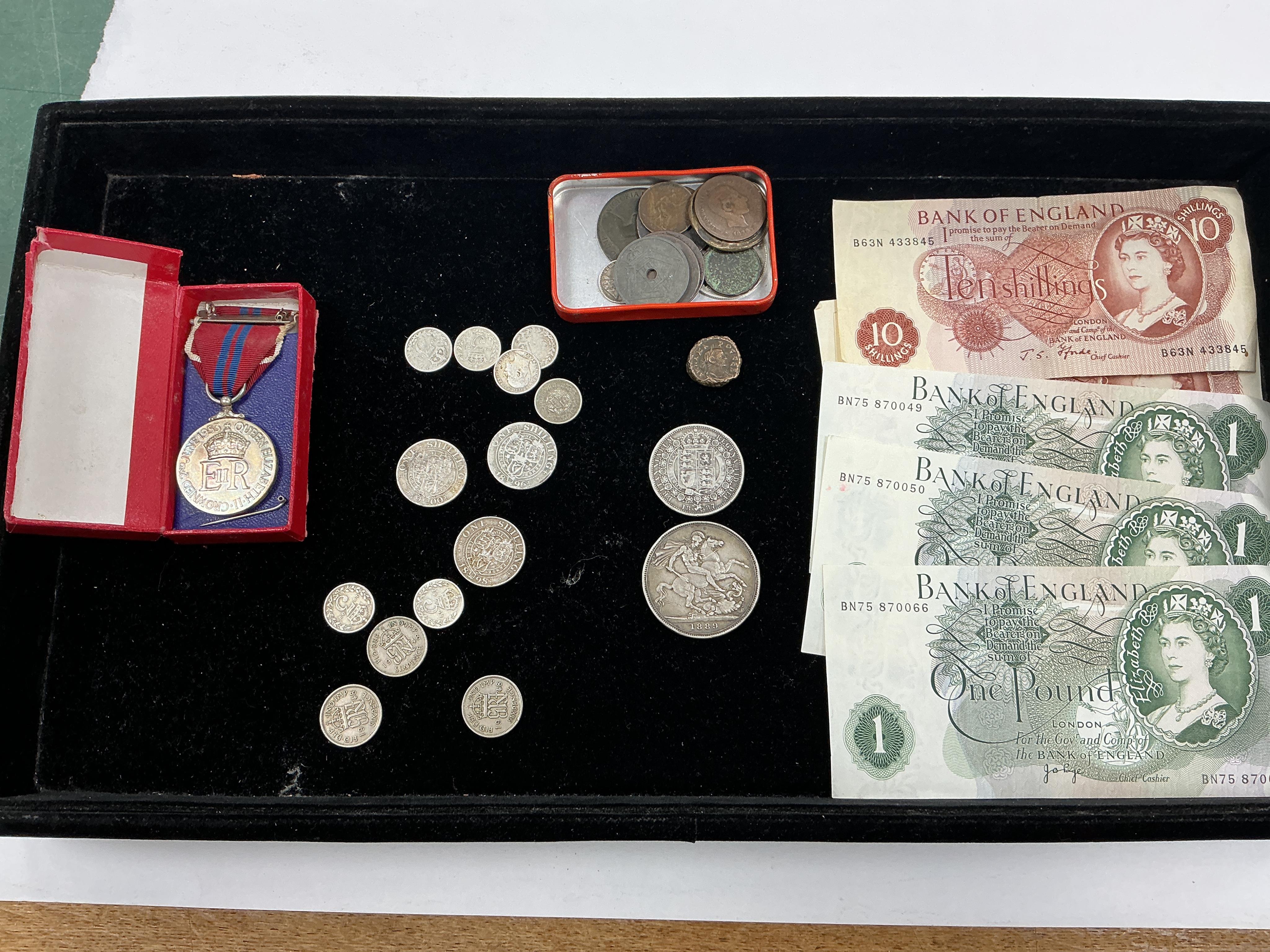 British and world coins and bank notes, Victoria to Elizabeth II, highlights include Victoria, silver crown, 1889, half crown 1887, three shillings, 1896, 1898 and 1900, various threepences, 19th/20th century pennies, halfpennies etc, Bank of England £1 notes, page signature, and a QE2 coronation medal, in a tin