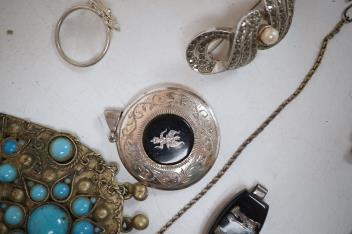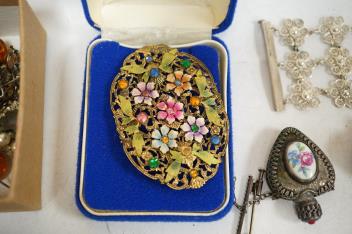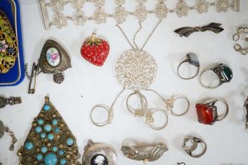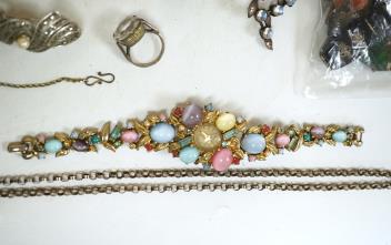 A large collection of silver and costume jewels, including a hardstone cabochon bracelet; an Indian filigree hathpul hand ornament; two filigree bracelets; a pair of Indian simulant pearl and red paste earrings; a silver chain necklace; a moonstone scorpion brooch; a moonstone brooch of foliate design; a multicoloured paste cocktail watch by Kolbert; and a quantity of costume jewels of various designs