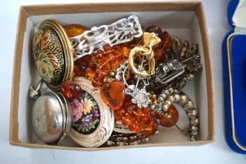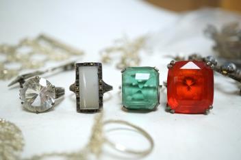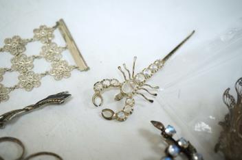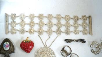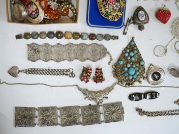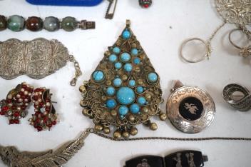Lot 1943 , A large collection of silver and costume jewels, including a hardstone cabochon bracelet; an Indian filigree hathpul hand ornament; two filigree bracelets; a pair of Indian simulant pearl and red paste earrings; a silver