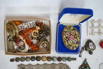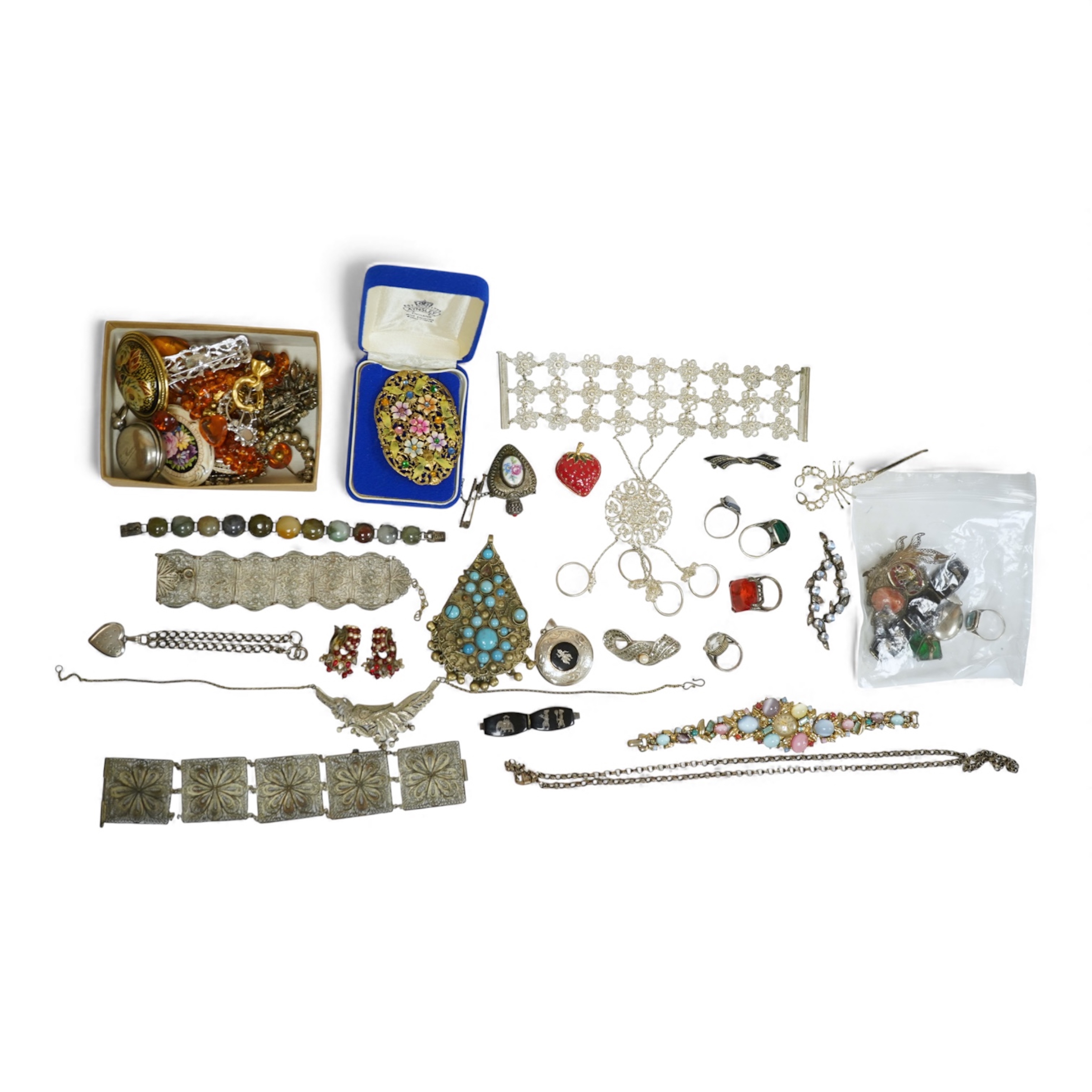 A large collection of silver and costume jewels, including a hardstone cabochon bracelet; an Indian filigree hathpul hand ornament; two filigree bracelets; a pair of Indian simulant pearl and red paste earrings; a silver