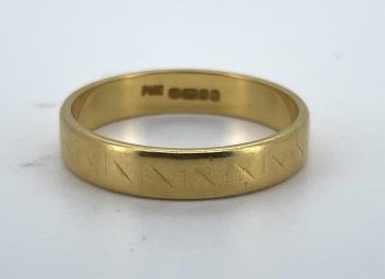 Lot 1949 , A 22ct gold wedding band, with geometric decoration, size O, 4mm width, British hallmarks, date letter for 1963, gross weight approximately 4 grams