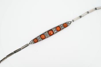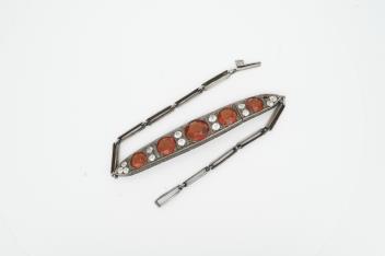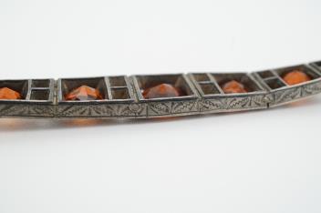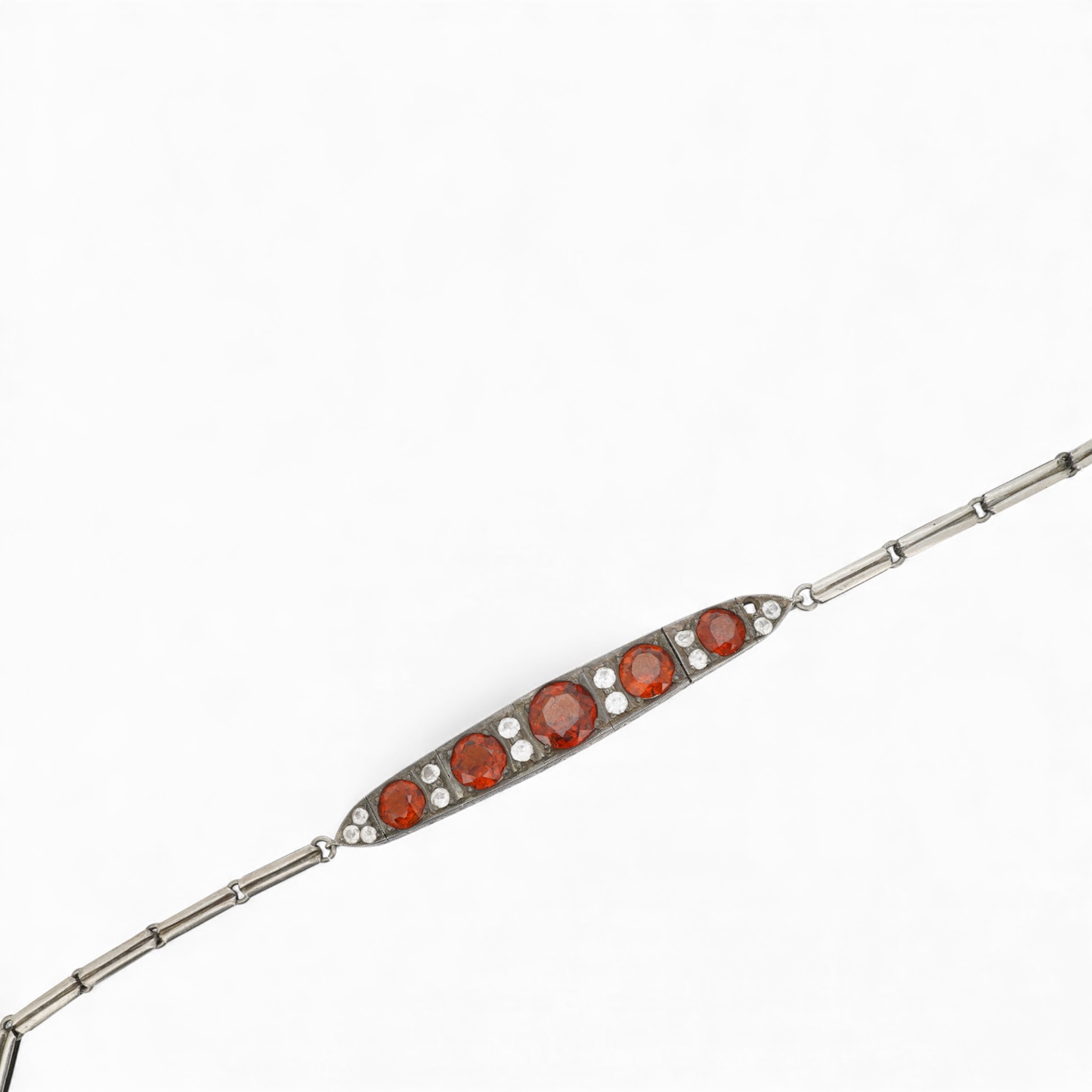 Lot 1941 , A hessonite garnet bracelet, centring on an articulated panel set with circular-cut hessonite garnets spaced by colourless pastes, the reverse composed of elongated linking, mounted in silver, length 18.5cm, one paste st