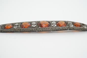 A hessonite garnet bracelet, centring on an articulated panel set with circular-cut hessonite garnets spaced by colourless pastes, the reverse composed of elongated linking, mounted in silver, length 18.5cm, one paste stone deficient