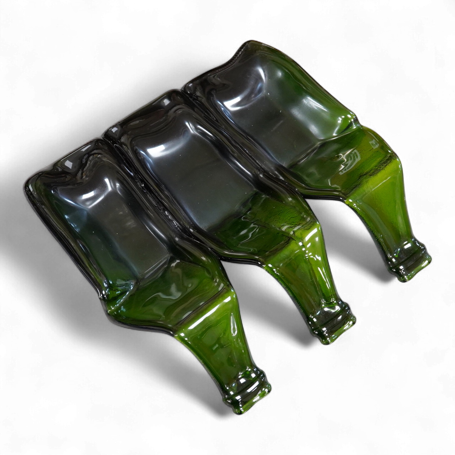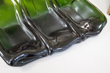 A Mary Canny green art glass, three sectioned ‘Champagne tray’, 29.5cm deep x 30.5cm wide